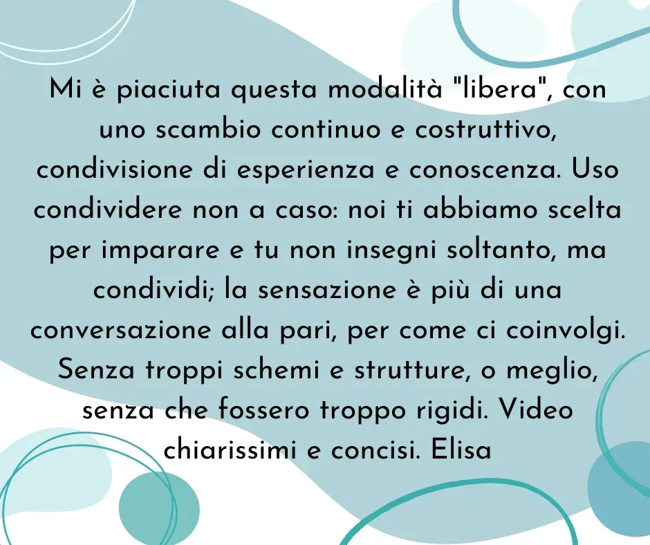 Le prime quarantene durante il covid mi hanno spinta a trasformare i corsi in presenza che erano stati programmati in corsi online. Questo mi ha permesso di comprendere quanto un corso online possa dare spesso più strumenti alle persone che vi partecipano. Così ho deciso che tutta la parte teorica l'avrei strutturata online: le persone possono guardare le lezioni quante volte vogliono e quando vogliono, potendo così ottimizzare e imparare meglio.